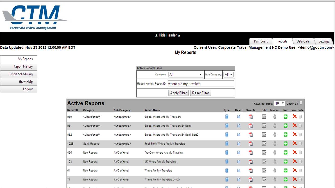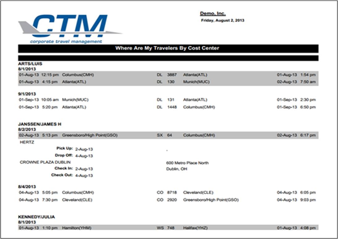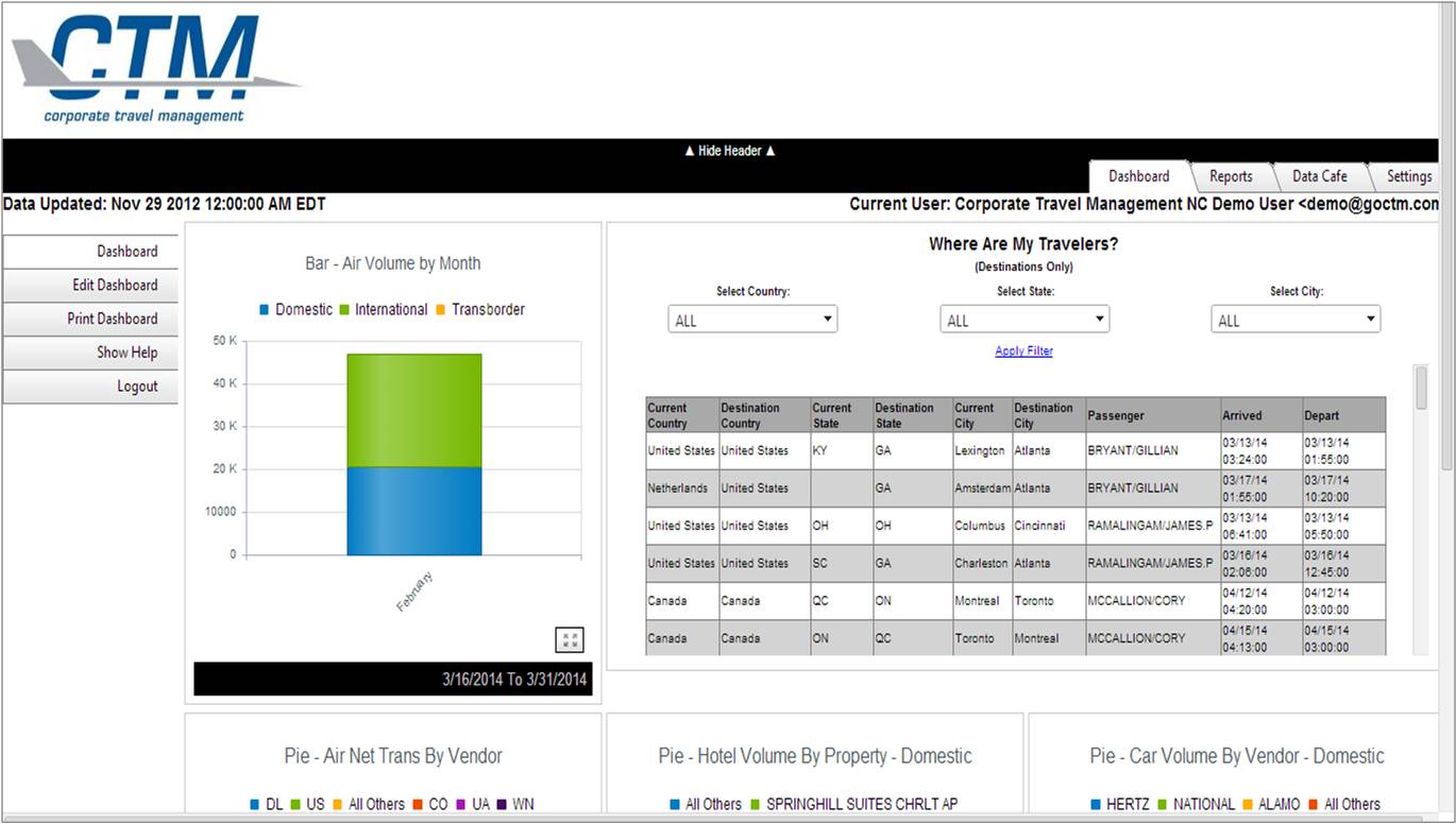 Need to find your travelers? With CTM Data Management, you can access 'Where Are My Travelers' which allows you to see where your travelers are based on their reserved and ticketed itineraries. From the initial dashboard screen, users can manipulate, and “slice and dice” data simply, with the click of a mouse. Functions include (but are not limited to) adding columns, sorting by various items such as Flight Number, Departure City, and Passenger Name, drill-down, and export functionality via csv or xls. Additionally, in the Report section, reports can be run for the current date, or future dates of travel.